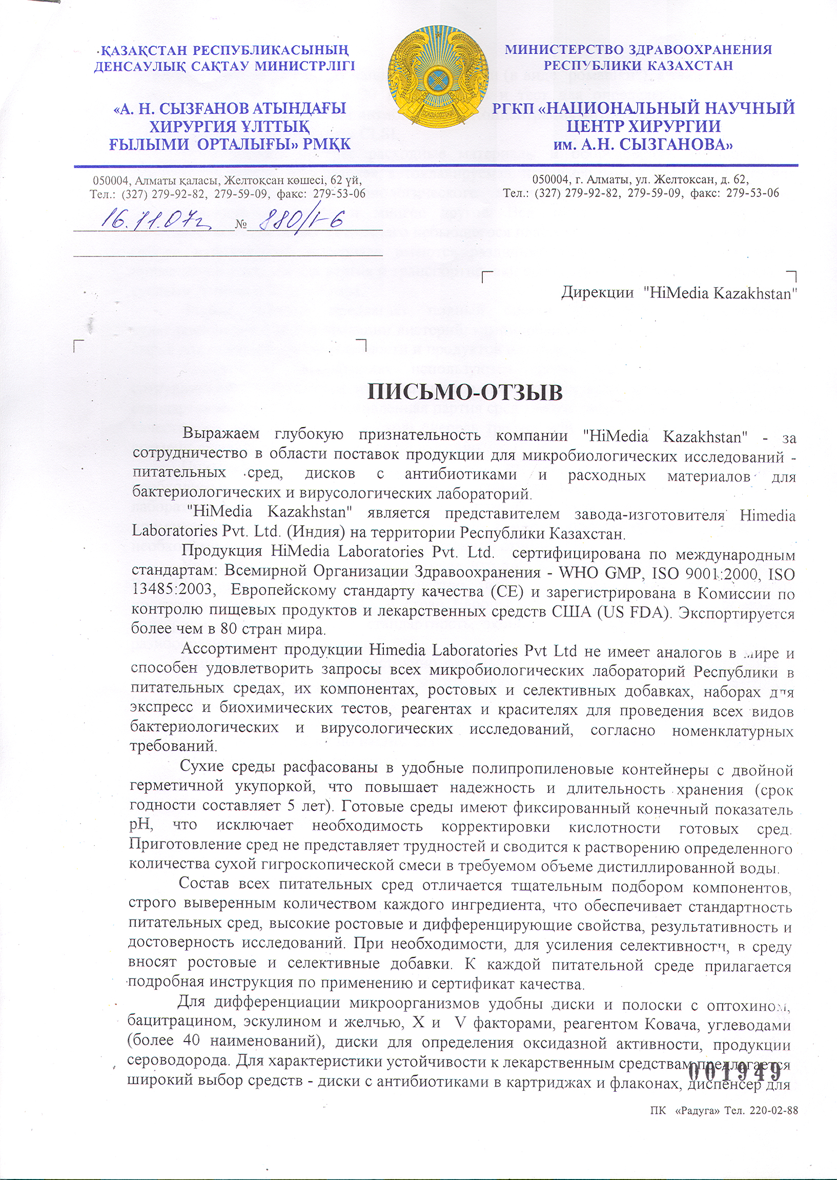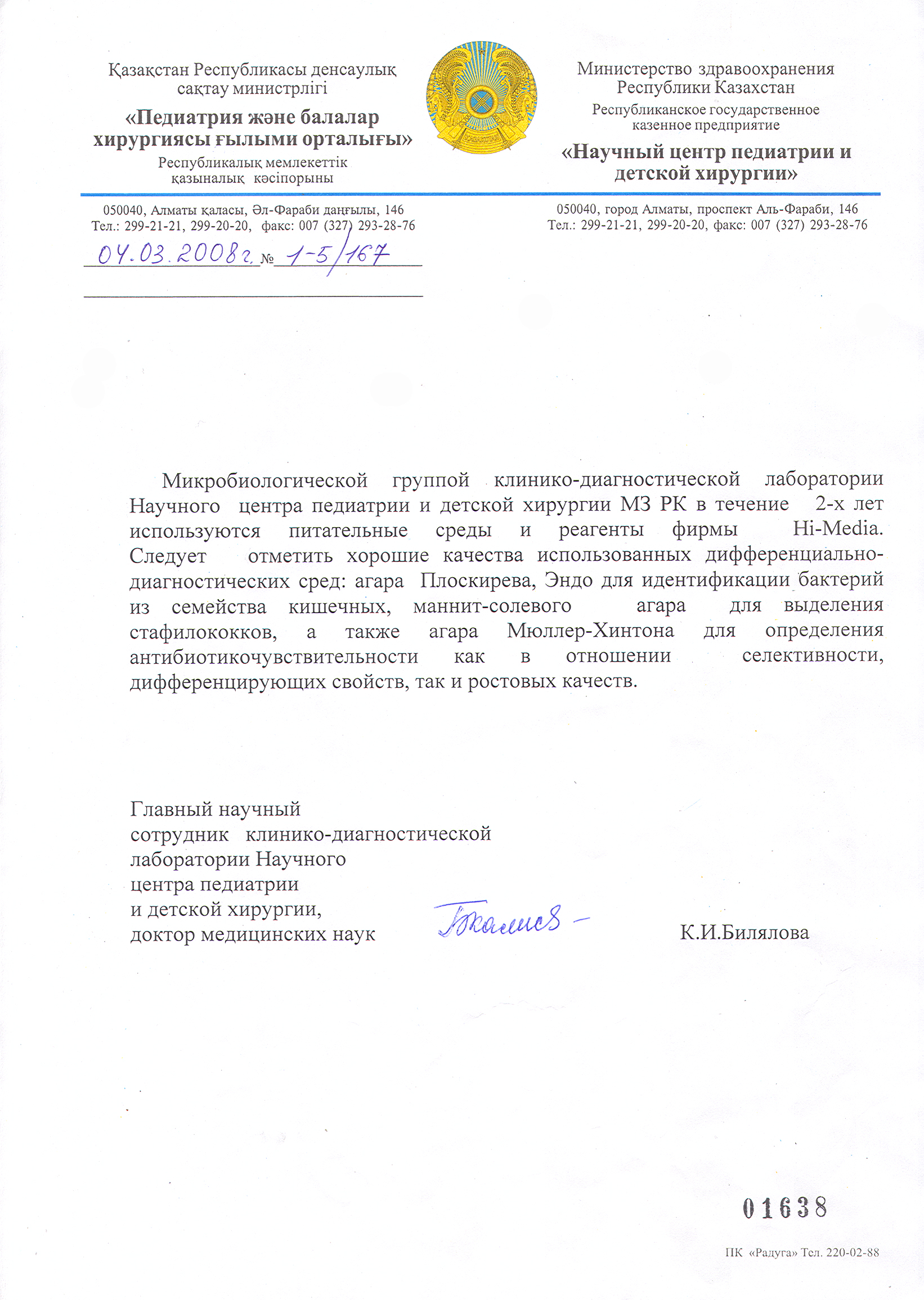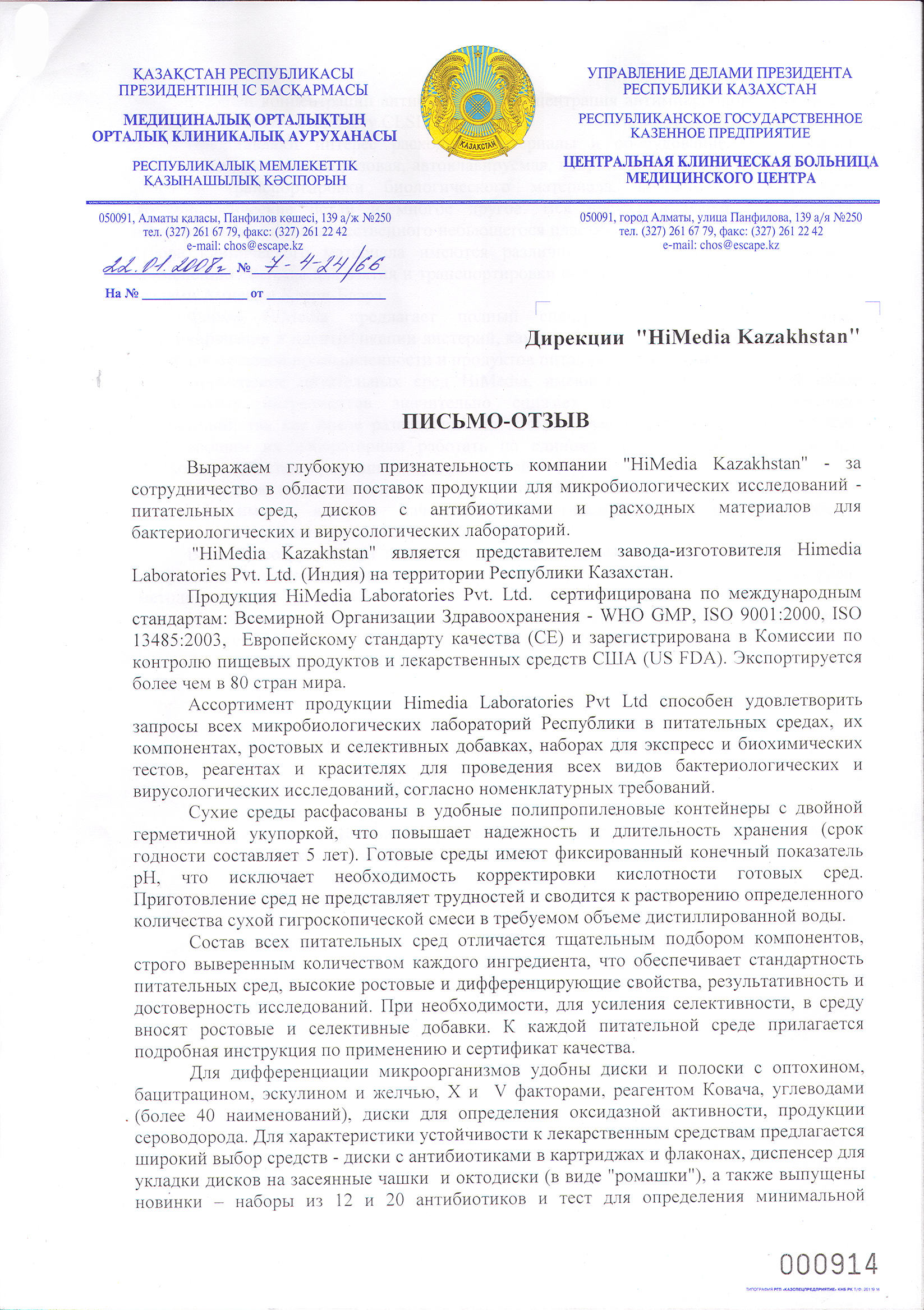 Ассортимент продукции HiMedia Laboratories Pvt. Ltd. способен удовлетворить запросы всех микробиологических лабораторий Республики в питательных средах, их компонентах, ростовых и селективных добавках, наборах для экспресс и биохимических тестов, реагентах и красителей для проведения всех видов бактериологических и вирусологических исследований, согласно номенклатурных требований