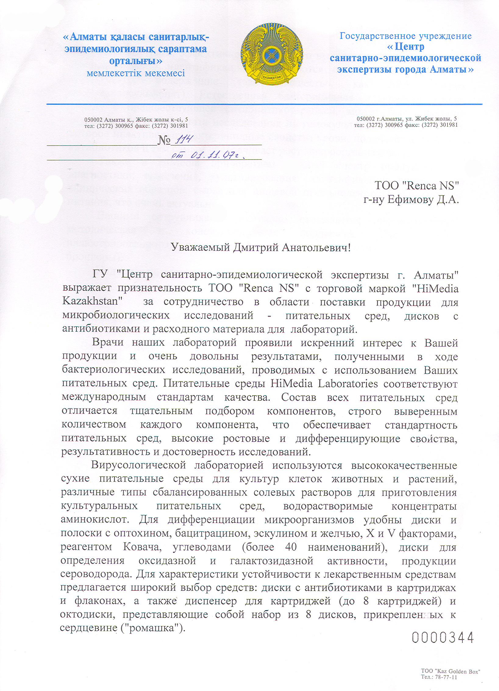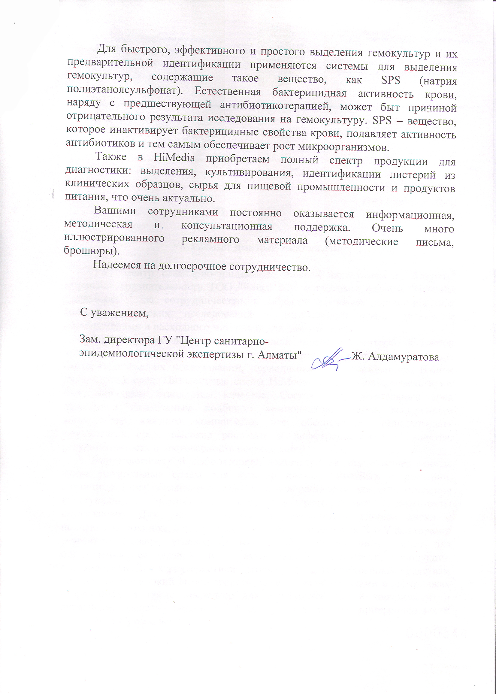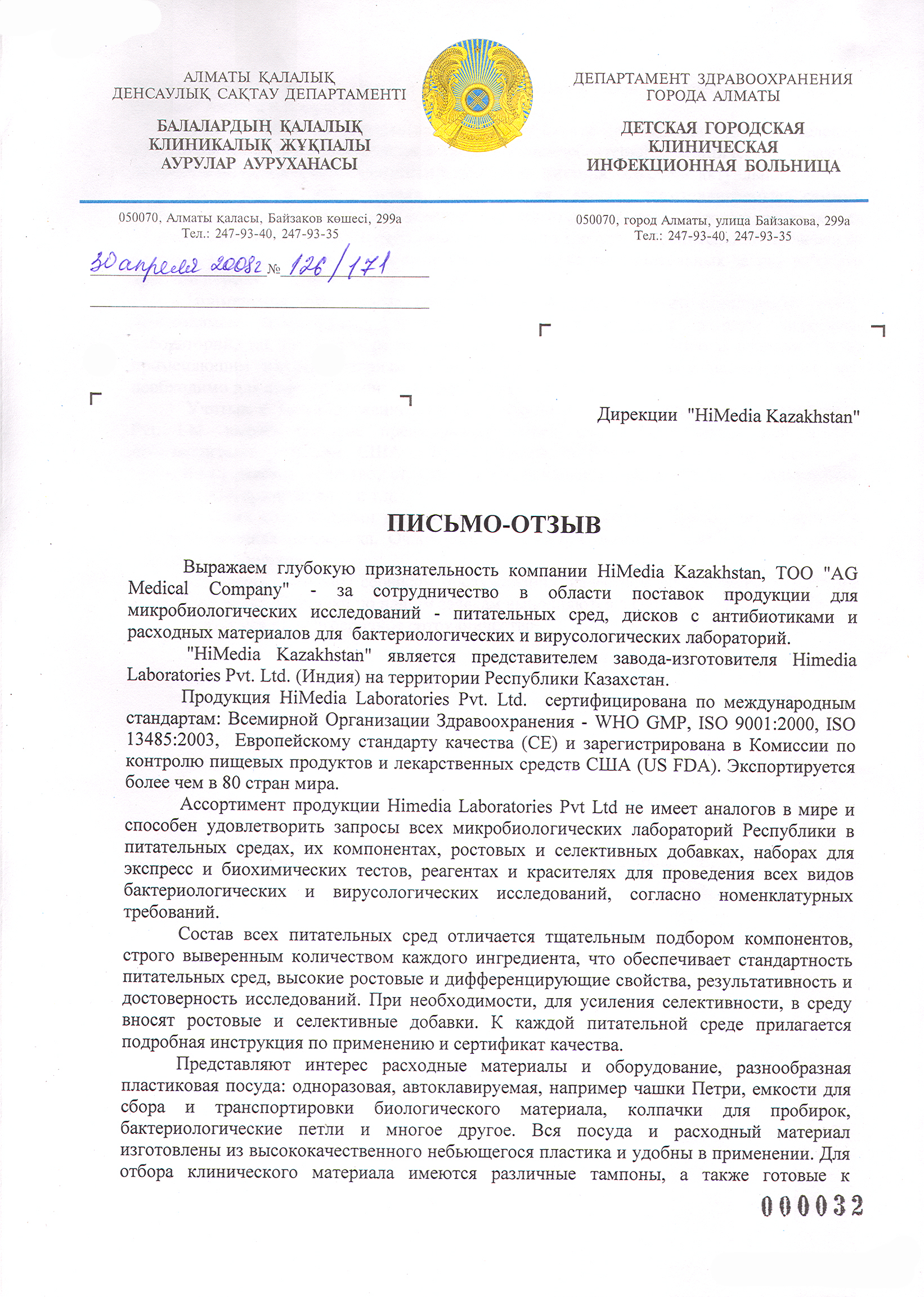 Ассортимент продукции HiMedia Laboratories Pvt. Ltd. способен удовлетворить запросы всех микробиологических лабораторий Республики в питательных средах, их компонентах, ростовых и селективных добавках, наборах для экспресс и биохимических тестов, реагентах и красителей для проведения всех видов бактериологических и вирусологических исследований, согласно номенклатурных требований