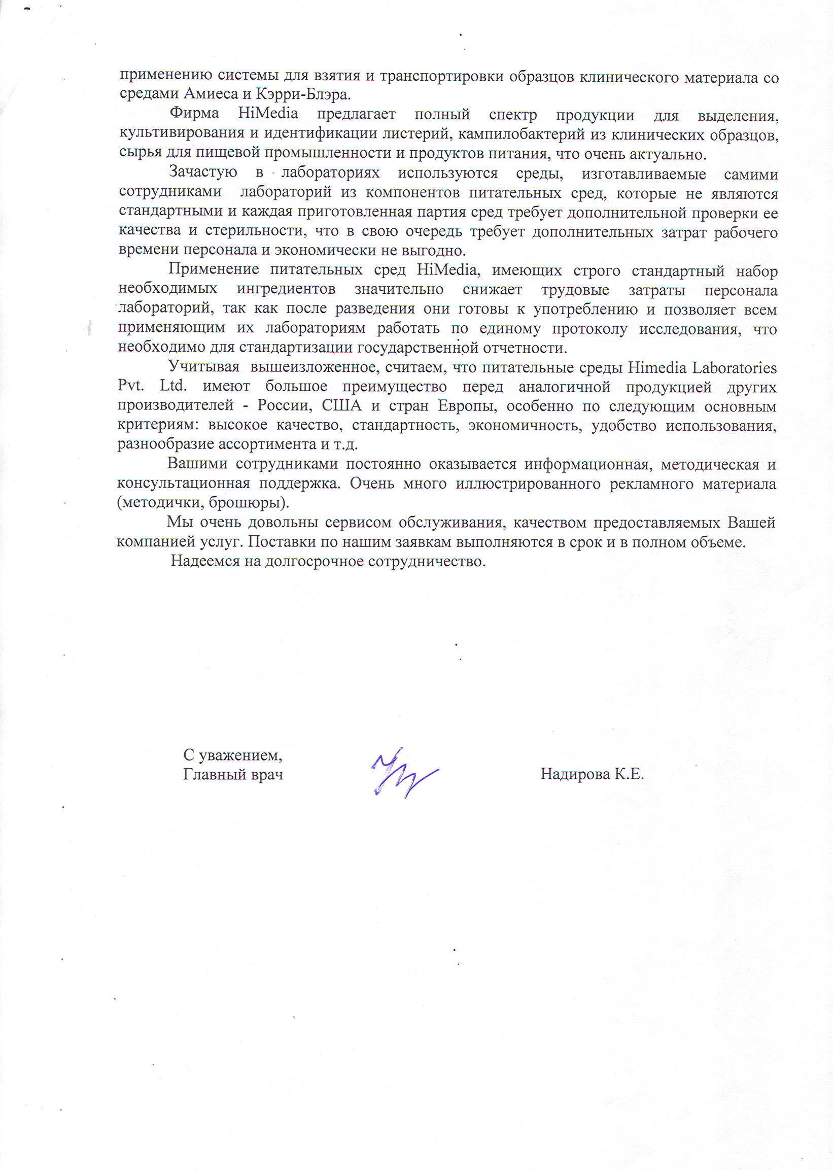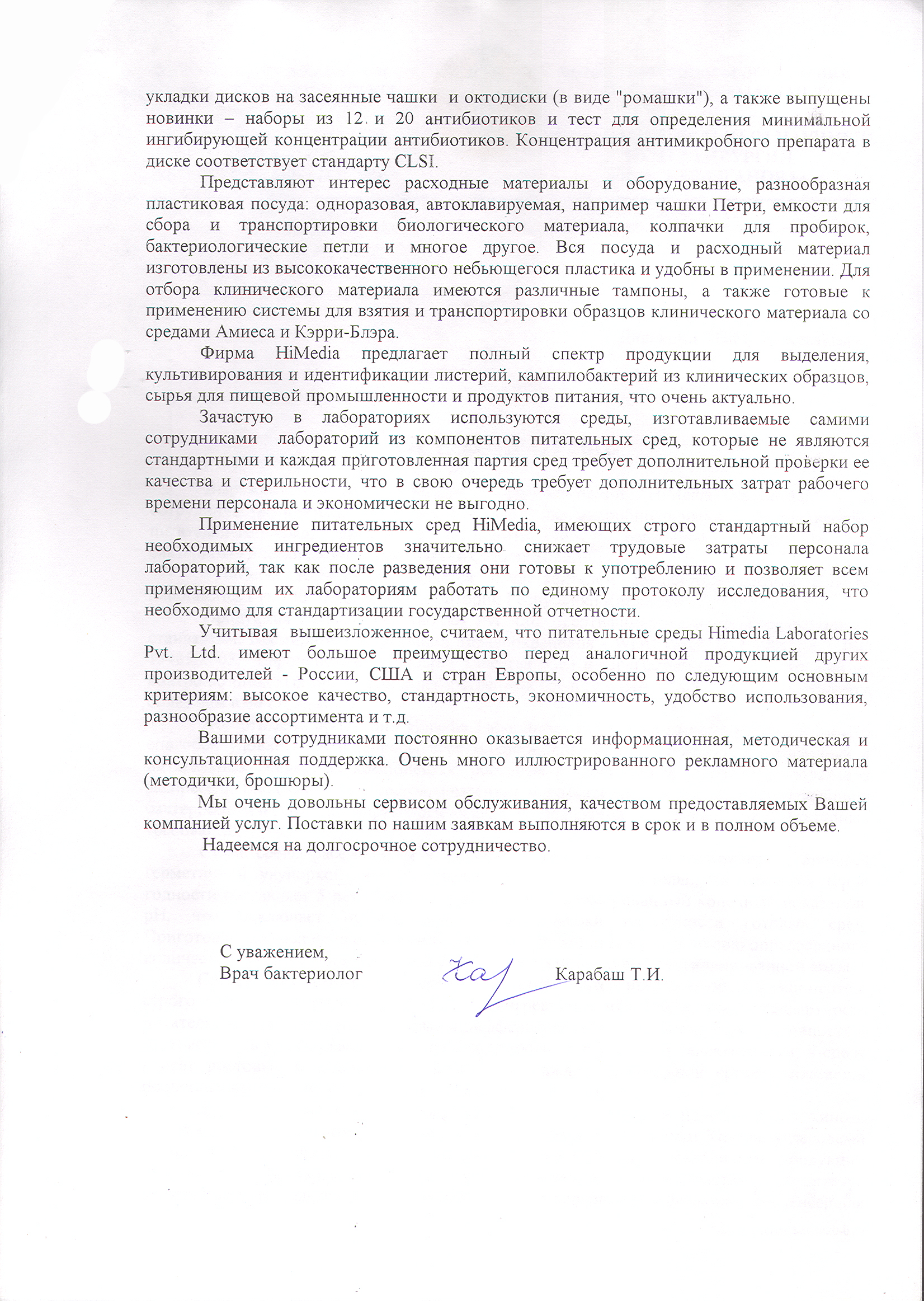В течение 2-х лет нами используются питательные среды и реагенты фирмы HiMedia. Следует отметить хорошие качества использованных дифференциально-диагностических сред.